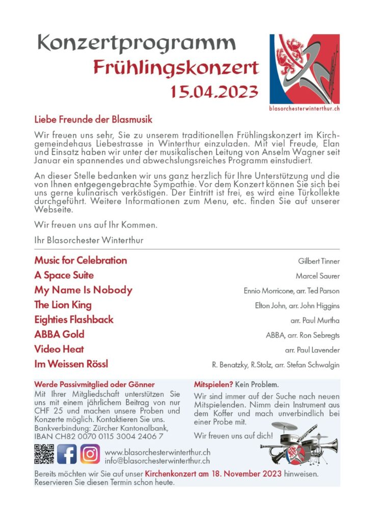 Wir sind ein ambitioniertes Blasorchester und suchen dich! Egal ob alter Hase oder Neuling – wir freuen uns immer über Verstärkung in allen Registern. Wir proben jeweils am Mittwoch von 20:00 bis 22:00 Uhr in unserem Probelokal in nächster Nähe zum Bahnhof Winterthur. Bist du interessiert? Dann entstaube dein Instrument und spiele unverbindlich an einer Probe mit – oder nimm Kontakt mit unserem Präsidenten auf. Mehr über uns findest du in unserem Vereinsportrait.